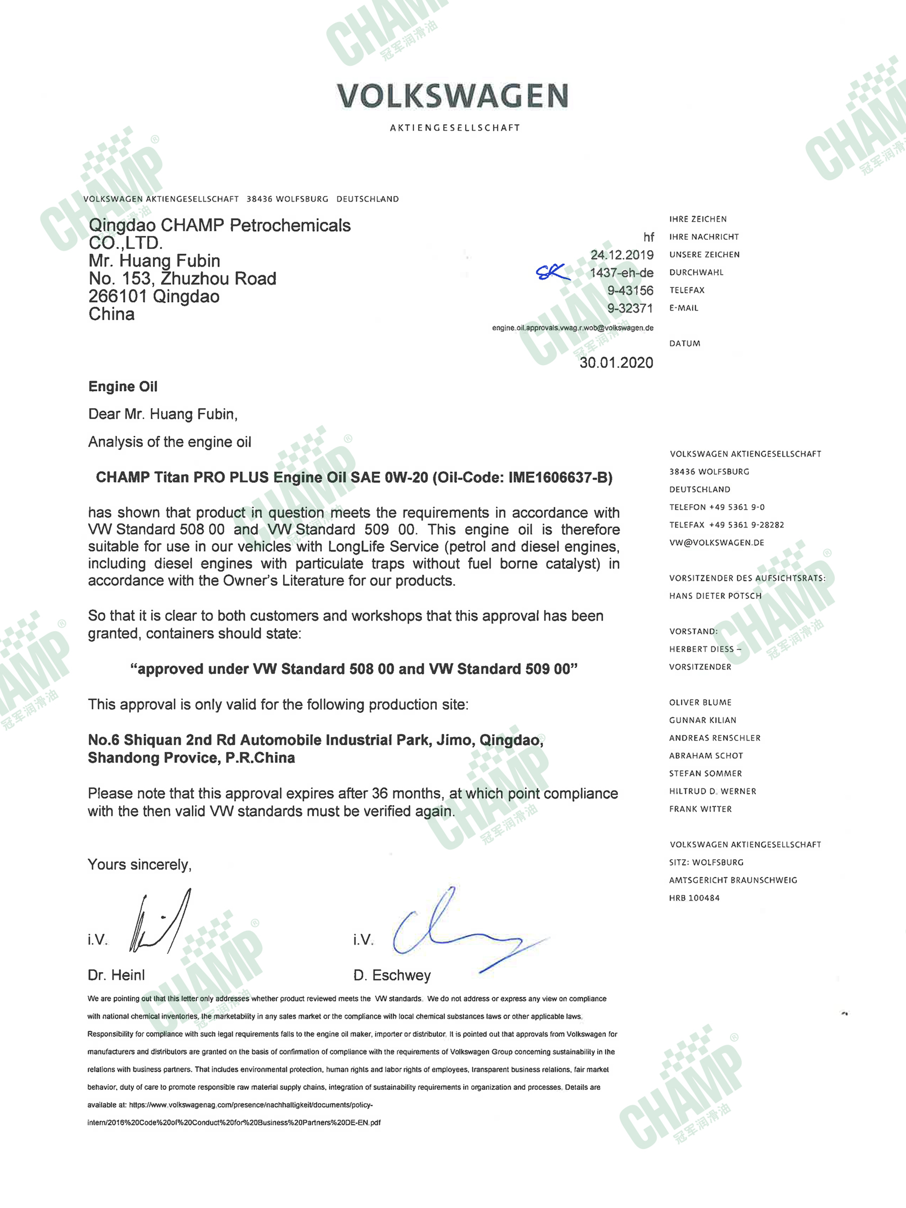 冠軍鈦能、嘉能系列的多款發(fā)動機油獲得大眾汽車VW 50200/50500、VW 50800/50900、VW 50400/50700認(rèn)證。