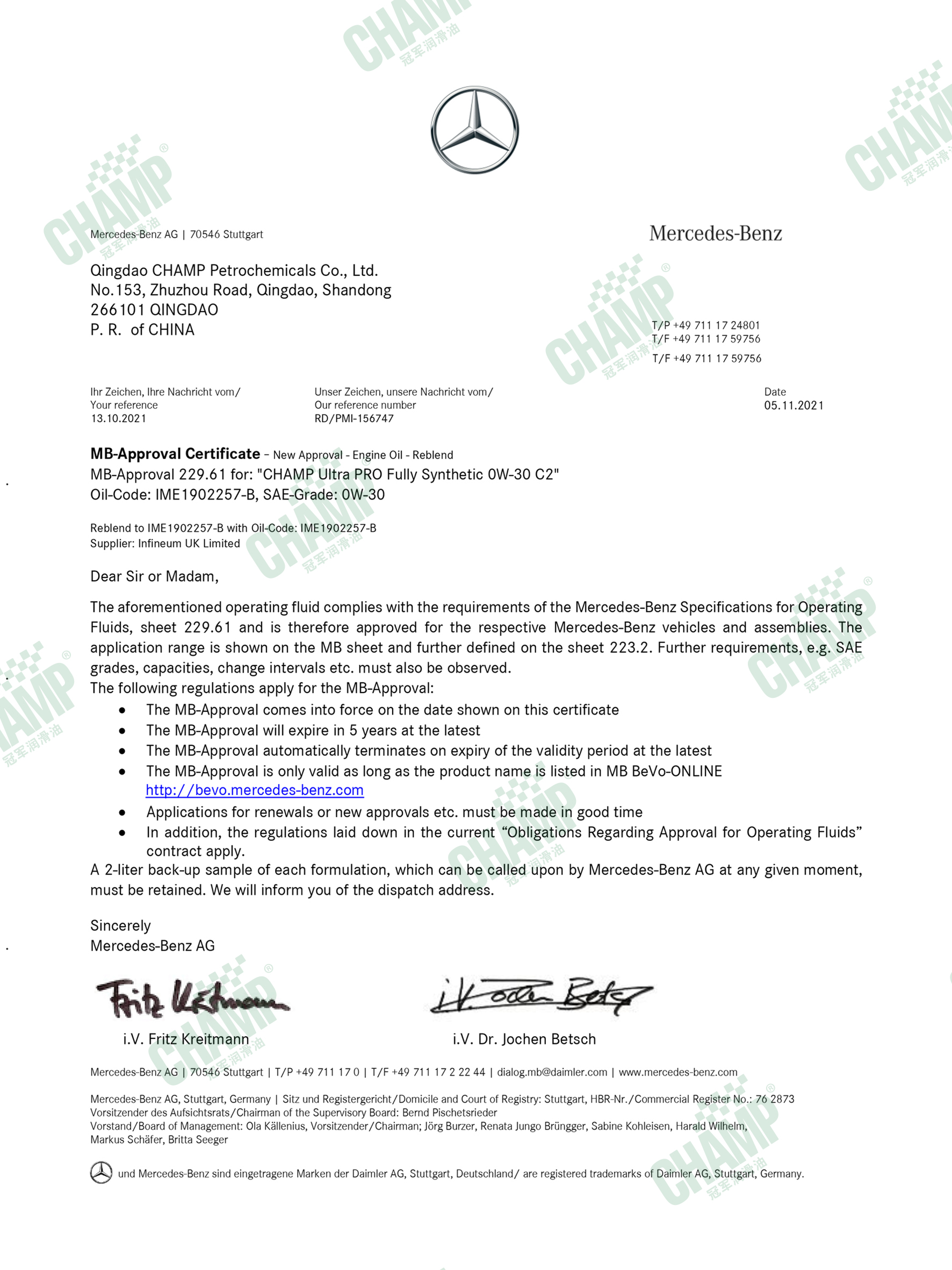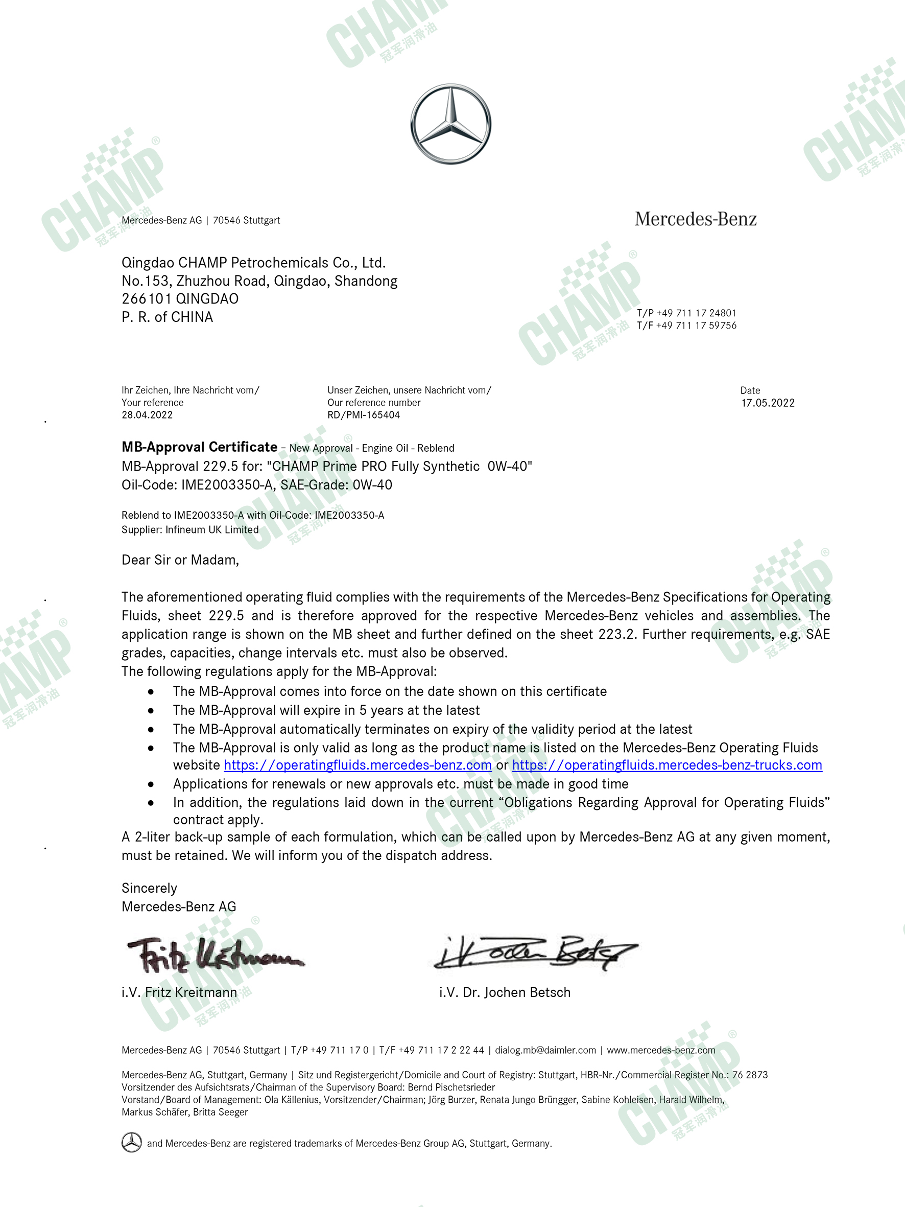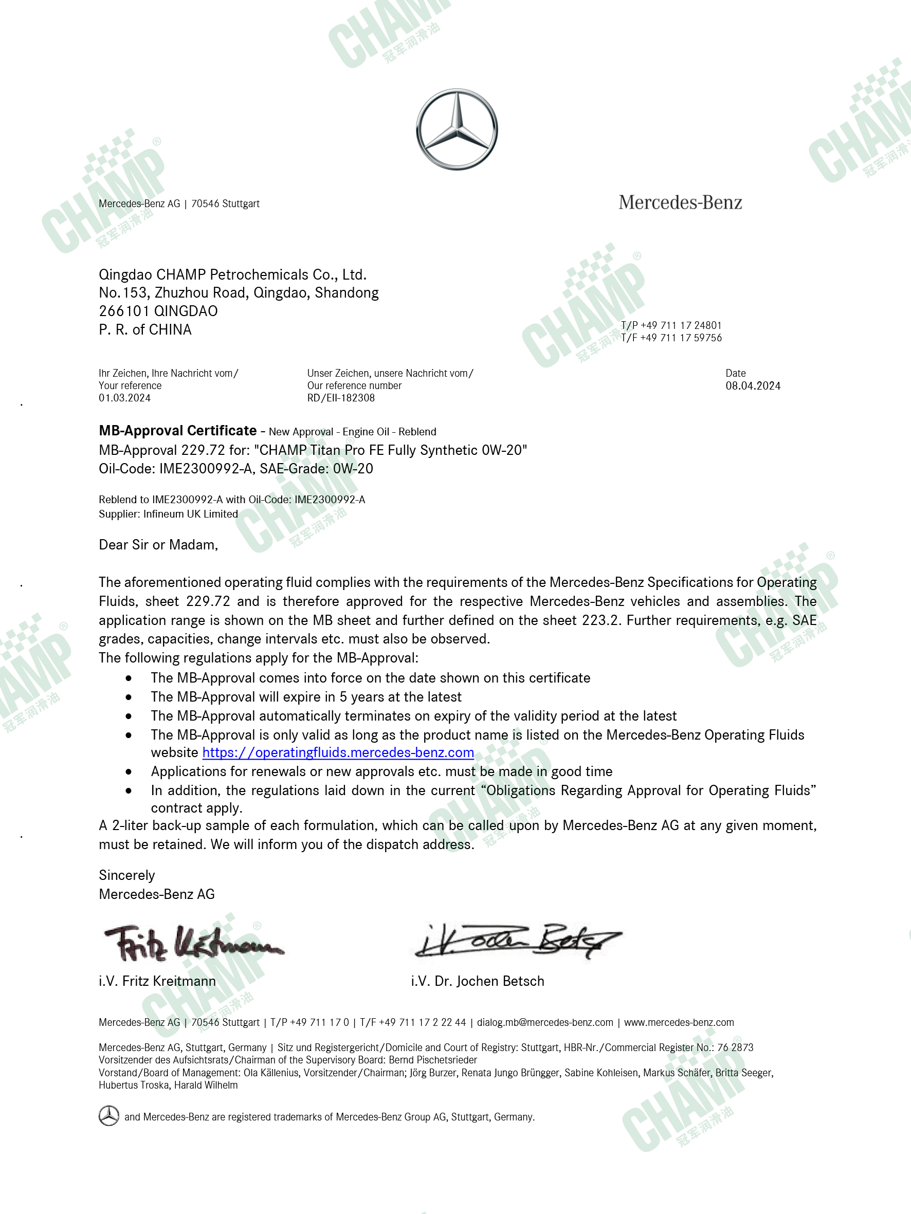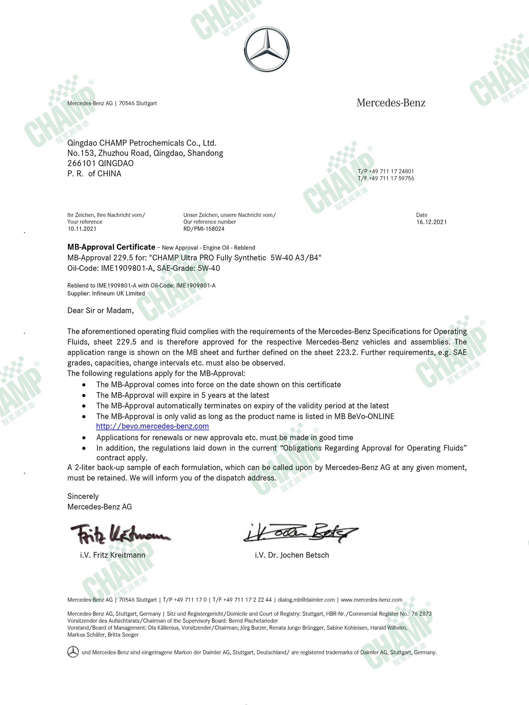 冠軍鈦能、磁能、嘉能等多款發(fā)動機油產(chǎn)品獲得奔馳汽車原廠認(rèn)證,是擁有奔馳乘用車長效認(rèn)證“大滿貫”的潤滑油品牌。