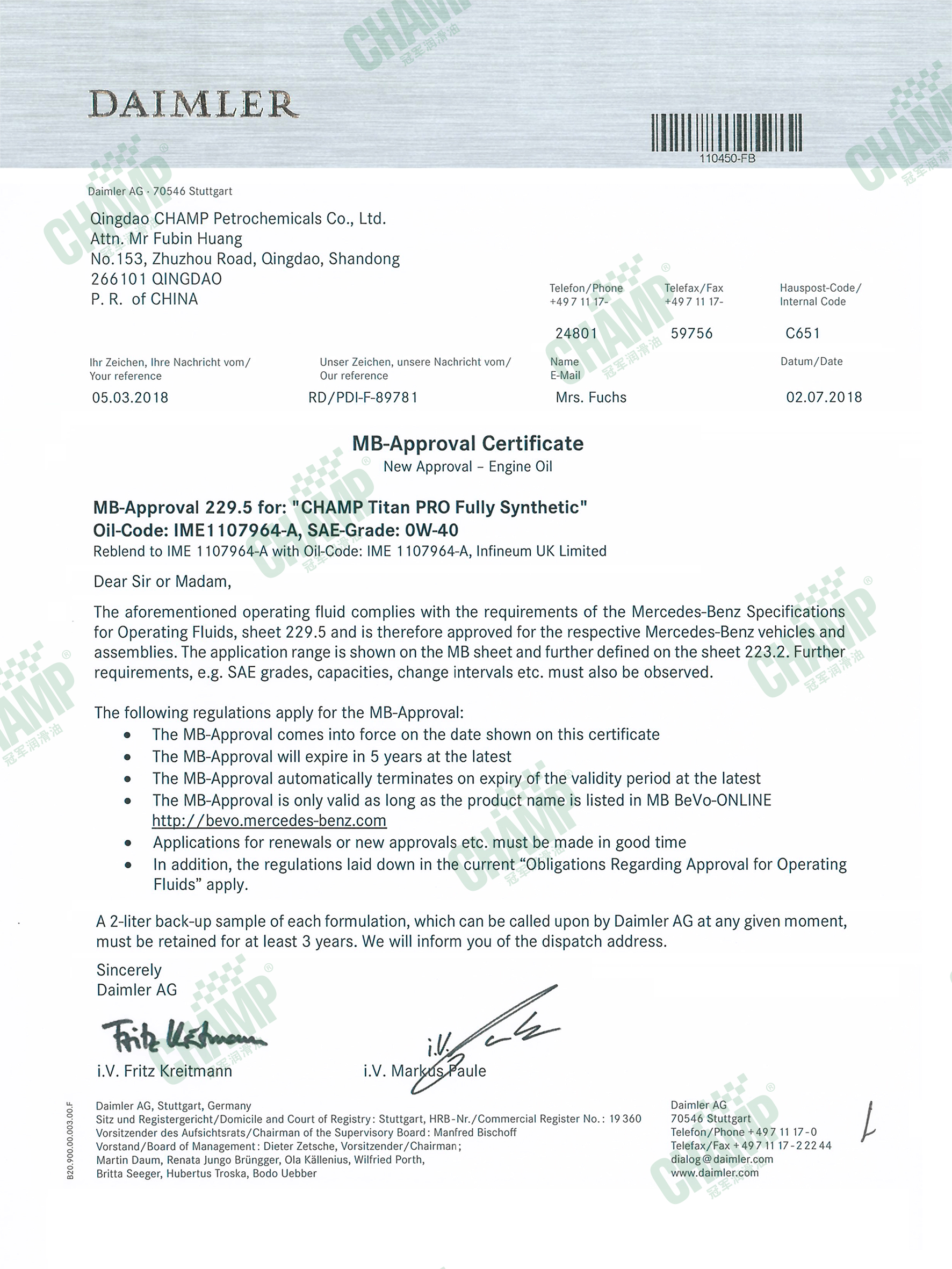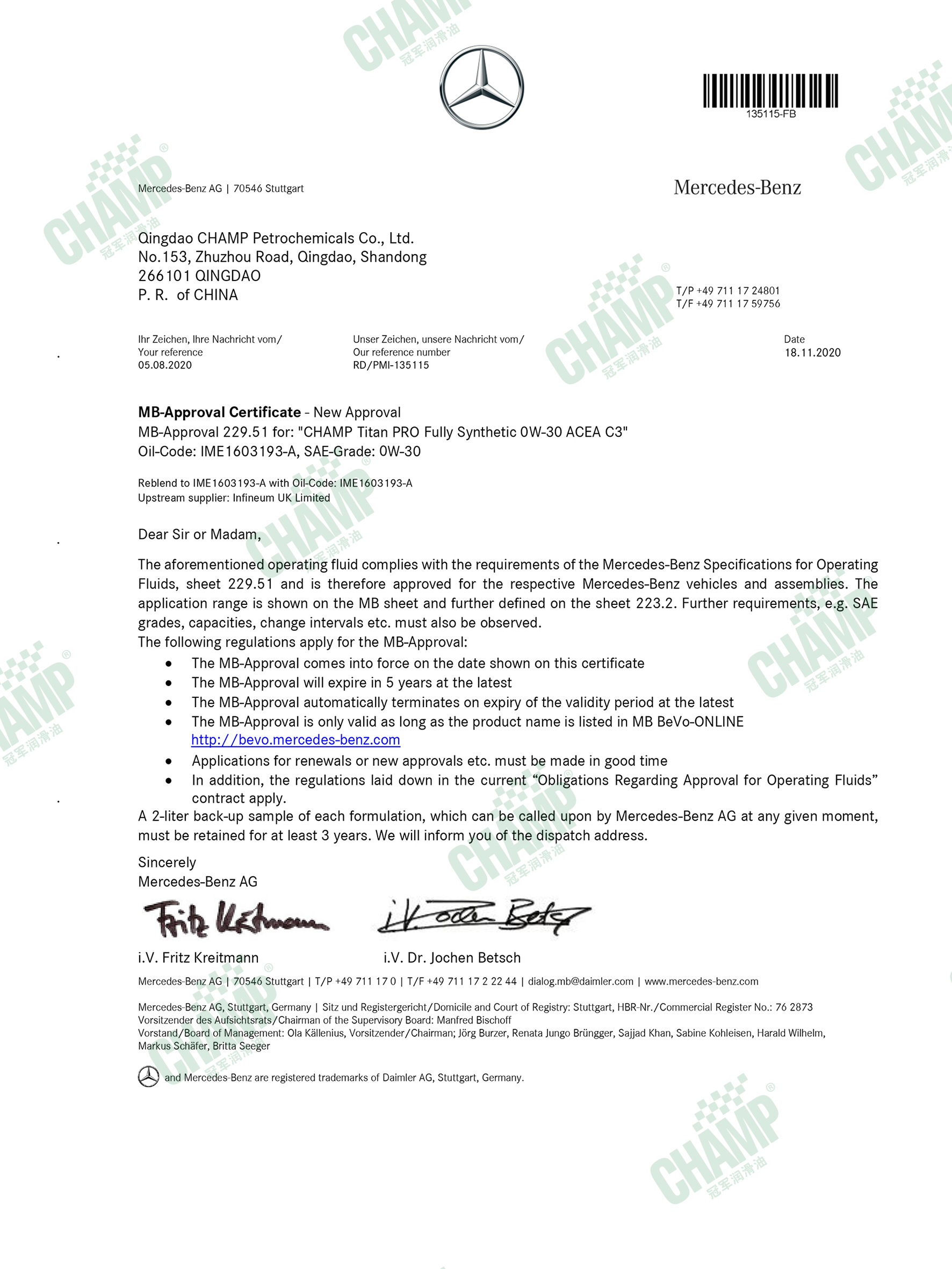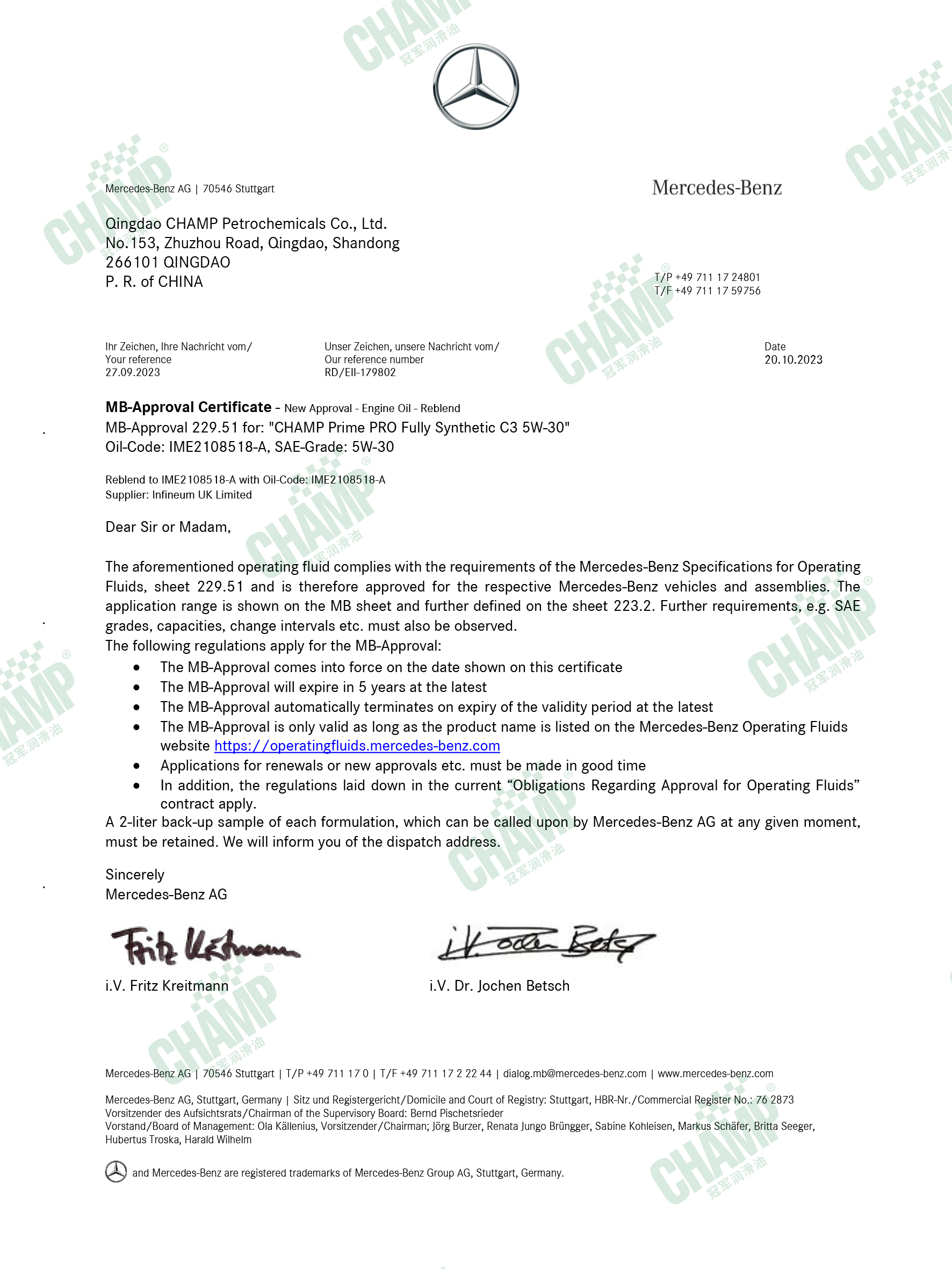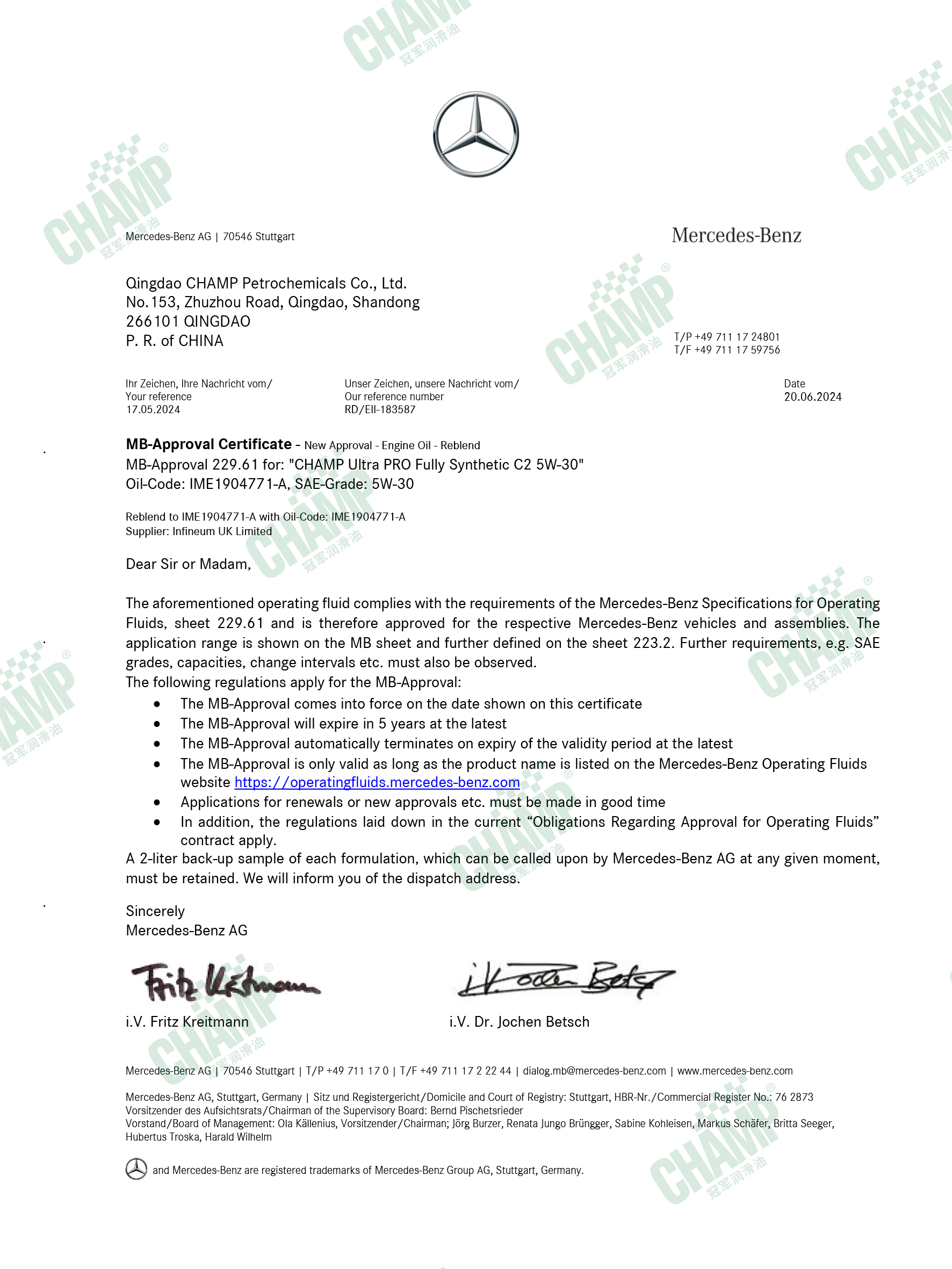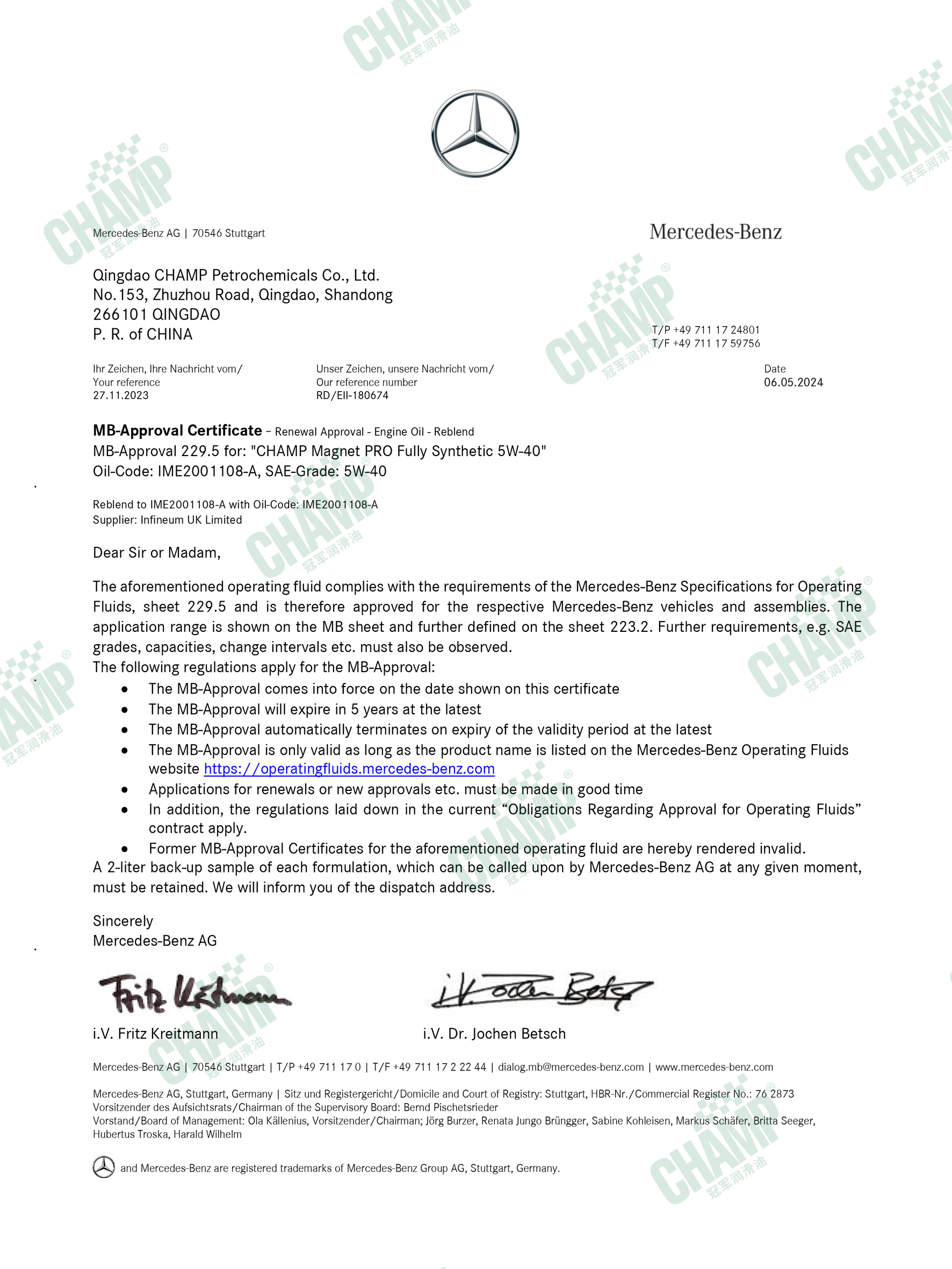 冠軍鈦能、磁能、嘉能等多款發(fā)動機油產(chǎn)品獲得奔馳汽車原廠認(rèn)證,是擁有奔馳乘用車長效認(rèn)證“大滿貫”的潤滑油品牌。
